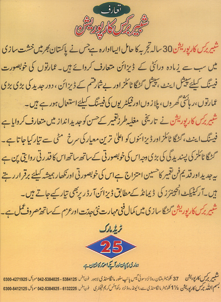 Historical Mughal Art of construction is being seen in modern age due to brilliant efforts of Shabbir Bricks Corporation . Gutka Tiles and Facing bricks is attractable due to its natural and traditional look with a modern touch. Special features of Gutka Tiles facing bricks are economical and long life than other facing materials.